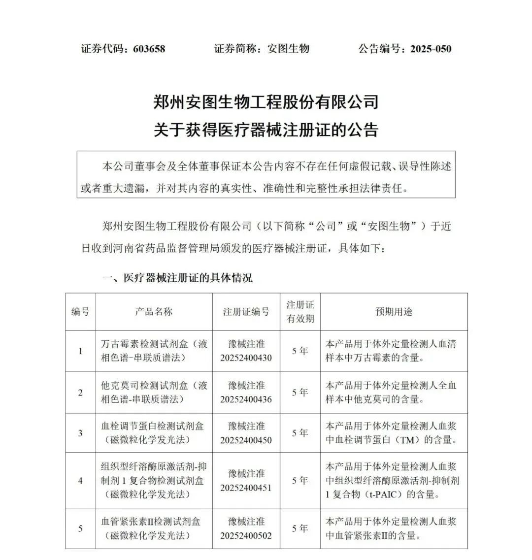 近期,安图生物(603658)万古霉素检测试剂盒(液相色谱-串联质谱法)、他克莫司检测试剂盒(液相色谱-串联质谱法)、血栓调节蛋白检测试剂盒(磁微粒化学发光法)、组织型纤溶酶原激活剂-抑制剂1复合物检测试剂盒(磁微粒化学发光法)、血管紧张素Ⅱ检测试剂盒(磁微粒化学发光法)等5项产品,获河南省药品监督管理局颁发的医疗器械注册证。新产品注册证的取得,进一步丰富公司产品线,不断满足市场需求。
